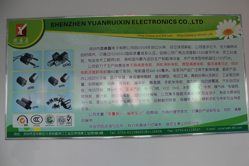 深圳市圓睿鑫電子有限公司自2008年創(chuàng)立以來(lái),經(jīng)過(guò)誠(chéng)信耕耘,在為期兩年的時(shí)間內(nèi),已通過(guò)ISO9001:2000國(guó)際質(zhì)量體系認(rèn)證。公司廠房占地面積2000多平方米,員工100人,專(zhuān)業(yè)技術(shù)工程師6名,擁有國(guó)內(nèi)最先進(jìn)的生產(chǎn)和檢測(cè)設(shè)備,年產(chǎn)各類(lèi)減速電機(jī)超過(guò)2~300萬(wàn)臺(tái)。因公司發(fā)展需要,于2020年底,將生產(chǎn)基地遷往擁有最美小鎮(zhèn)之稱(chēng)的東莞市清溪鎮(zhèn),依山傍水,依托美麗的大自然環(huán)境和地方文化,全新的東莞市圓睿鑫電子有限公司將借助深圳母公司平臺(tái),一步步走上新的臺(tái)階。 東莞公司將繼續(xù)致力于生產(chǎn)銷(xiāo)售各類(lèi)無(wú)刷減速電機(jī) 渦輪渦桿電機(jī),微型減速電機(jī),直流減速馬達(dá),交流手搖發(fā)電機(jī)、同步電機(jī)及空心杯電機(jī)等,電機(jī)直徑從6-60毫米為定位,系列產(chǎn)品廣泛用于智能家電、智能辦公自動(dòng)化設(shè)備、智能醫(yī)療、美容健身器材、遙控模型、電動(dòng)工具、高檔玩具以及其它工業(yè)驅(qū)動(dòng)裝置,如高檔玩具、游戲機(jī)、麻將機(jī)、飄香器、手機(jī)發(fā)電機(jī)、柔巾機(jī)、自動(dòng)噴霧器、汽車(chē)自動(dòng)設(shè)施、電動(dòng)牙刷、舞臺(tái)燈飾、圣誕產(chǎn)品、智能電子門(mén)鎖、VCD、DVD、水泵、氣泵、水表、煤氣閥、電磁閥、攪拌機(jī)、榨汁...